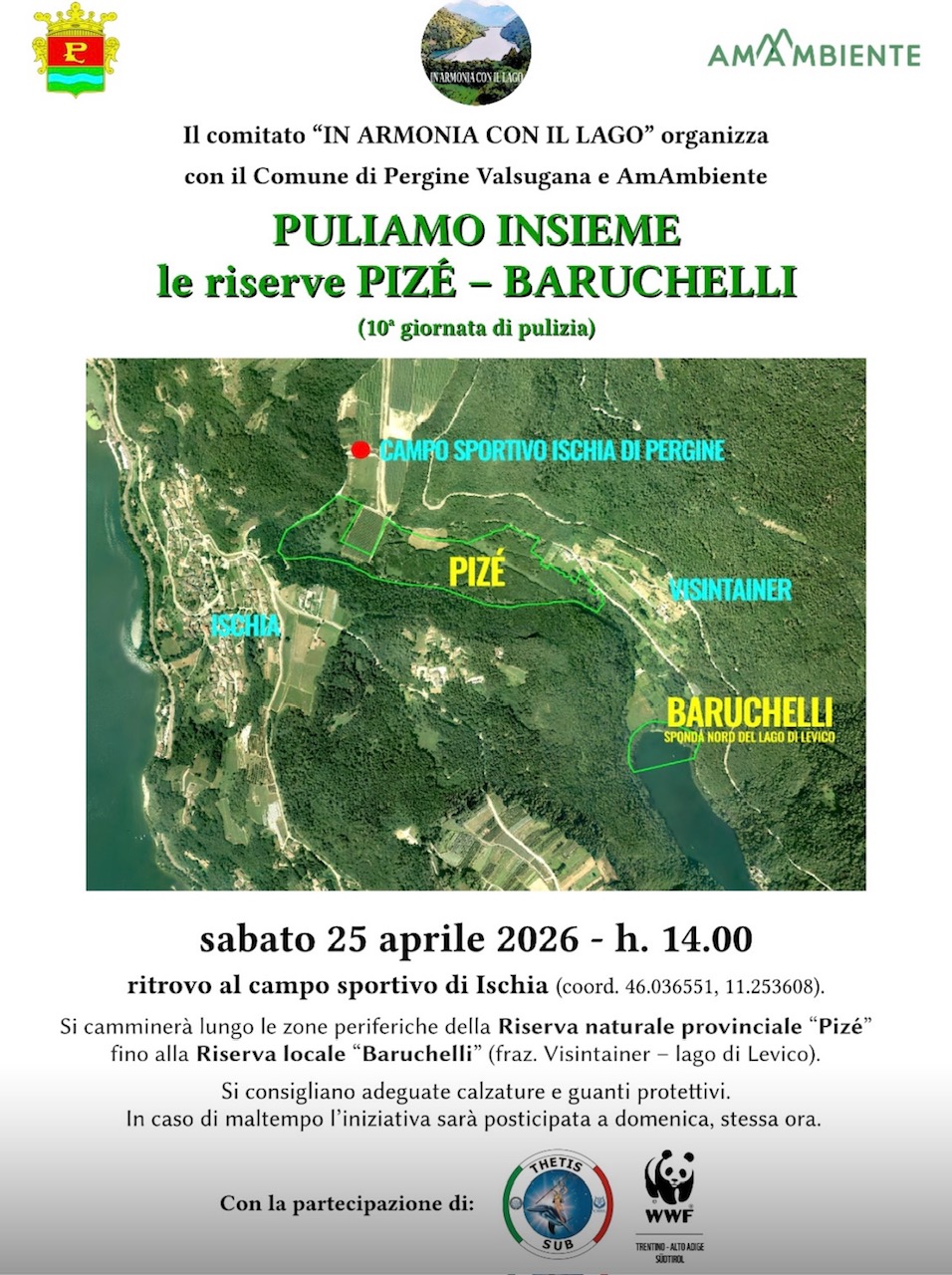 Il comitato "In armonia con il lago", in collaborazione con il Comune di Pergine Valsugana e AmAmbiente, organizza la decima giornata di pulizia ambientale "Puliamo insieme le riserve Pizé - Baruchelli". L'iniziativa vede anche la partecipazione di Thetis Sub e WWF Trentino-Alto Adige/Südtirol.